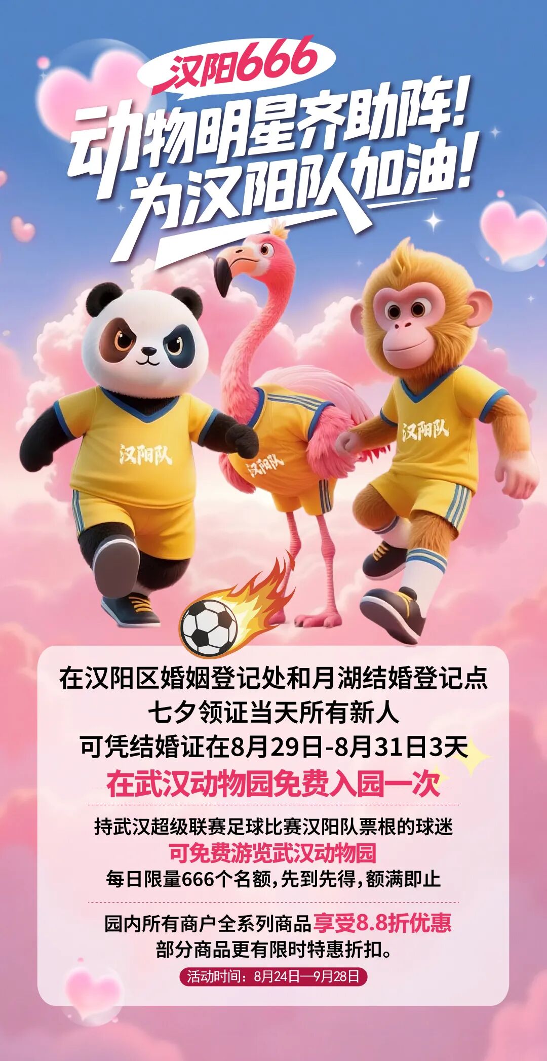 8月29日领证的新人们请注意!你们的结婚证将在8月29日-31日化身"浪漫密钥"——凭汉阳登记的结婚证可携爱人免费畅游武汉动物园。和国宝熊猫比心合影、与金丝猴分享爱的喜悦,让萌宠见证你们从"我"到"我们"的蜕变。