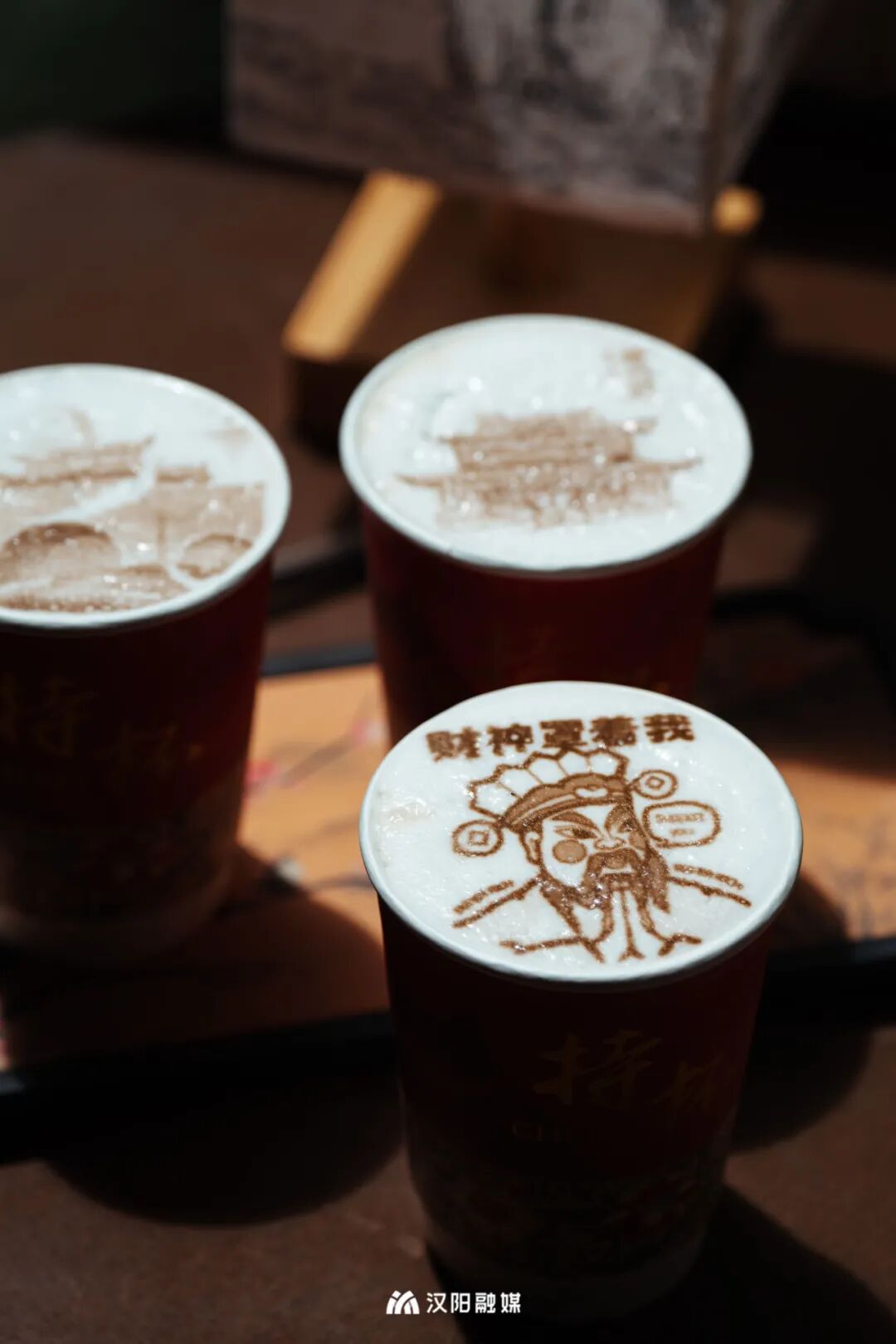 拉花是特色,因用咖啡液作图,只有拿铁可以做。图案以附近武汉特色建筑/字样为主,晴川阁、禹稷行宫、“第一山”石碑上的字……