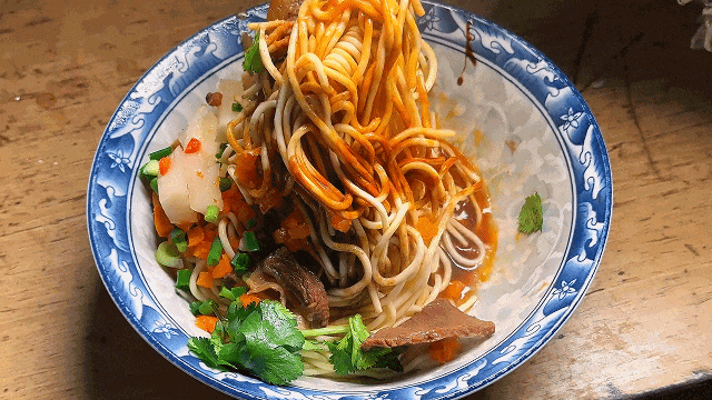 老板71岁,从24岁就开始开面馆,到今天已经47年了。几十年来老板坚持每天早上3点多起床亲手担面,面条筋道偏粗,5元一大碗,分量杠杠的,还送两片牛肉,瓷碗端上来就感觉回到了小时候。