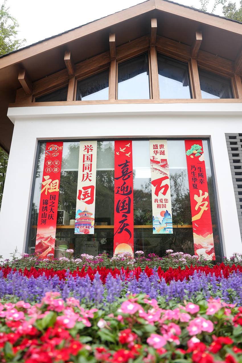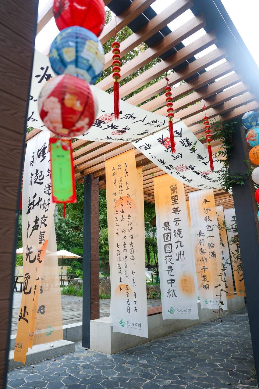 步入龟山公园,节日气息扑面而来。游客服务中心悬挂“但愿人长久,千里共婵娟”等诗词吊幔,与传统灯笼等国庆主题装饰相映成趣。