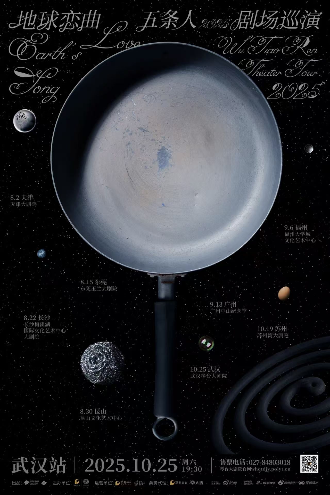 在今年第十四届琴台音乐节中,以九人编制构建“地球剧场”,以塑料袋为浪漫符号,将市井生活谱成诗篇的知名乐队五条人,将于10月25日晚19:30在武汉琴台大剧院带来其全新“宇宙级浪漫企划”——「地球恋曲」剧场巡演。这场演出标志着五条人成立近十年来首次大规模剧场巡演的全新启航,将以更丰富的音乐语言和舞台呈现,为观众搭建一个充满诗意与想象力的“地球剧场”。