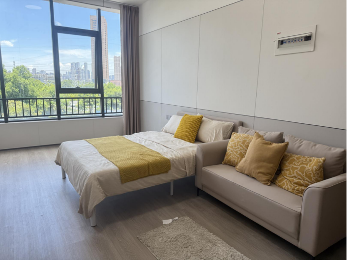 安家乐寓·动漫城位于汉阳区四新大道中关村动漫城7号楼,是专为人工智能及动漫产业青年量身打造的“AI智谷人才公寓”。项目以“一室一厅一厨一卫”的精致户型为主,面积达57平方米。室内配备独立厨房、天然气及全套品牌家电,包括电热水器、空调、洗衣机等,满足青年对品质生活的追求。