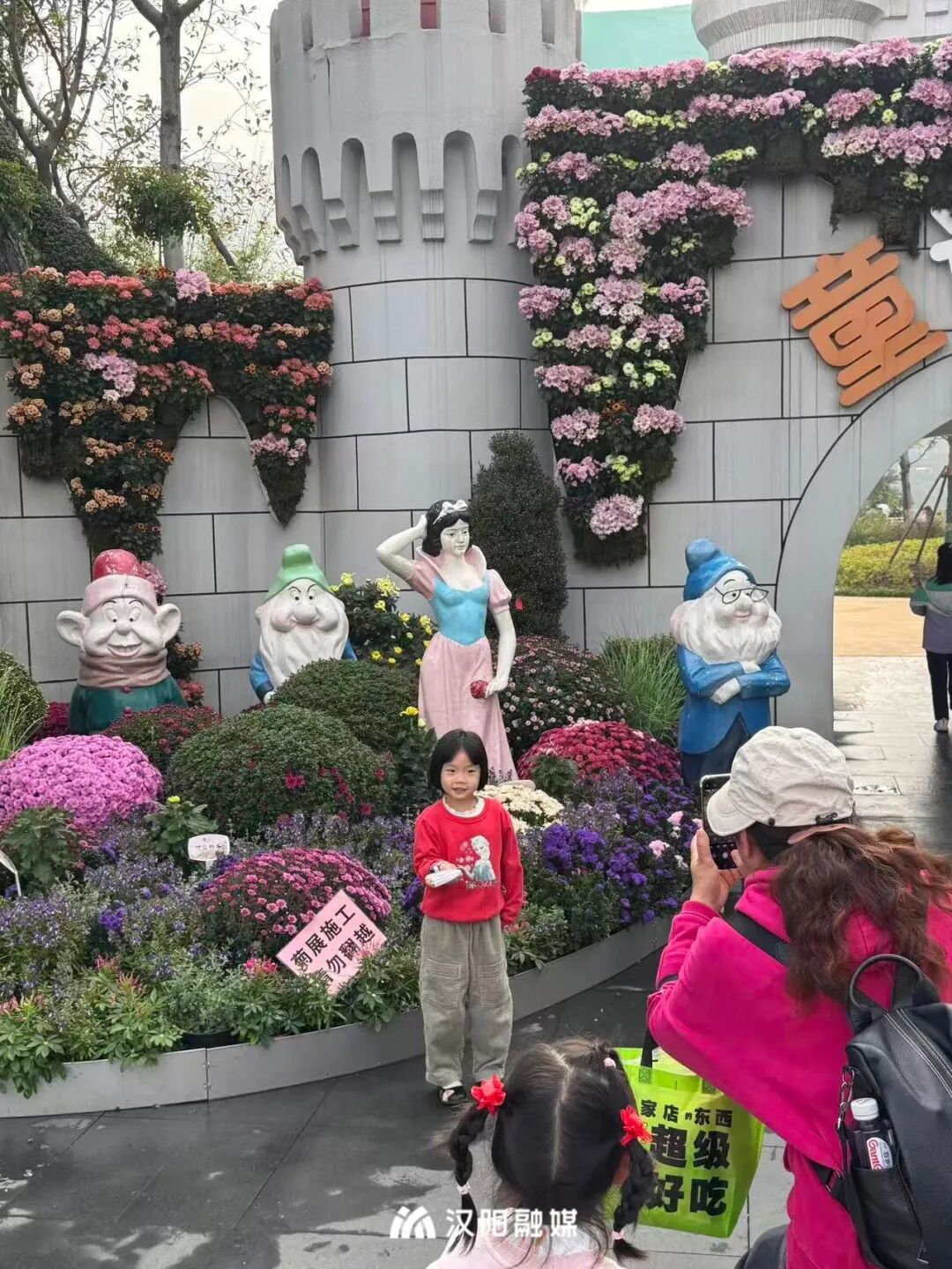 同样引人注目的还有憨态可掬的河马菊雕,犹如在花海中沐浴,成为开幕日的“打卡C位”。童话王国区域内,绿植外墙上的“垂直花园”旁,菊花簇拥着白雪公主与七个小矮人,引得孩子们纷纷驻足。园内接驳花车缓缓穿行,熊猫、松鼠等动物菊雕藏于花境,让市民在赏菊时同步感受动物园的独特氛围。