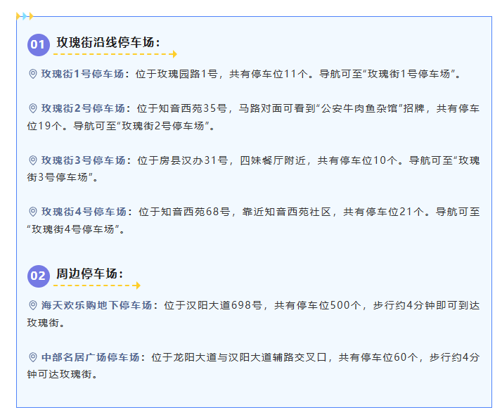 为优化停车服务,玫瑰街多管齐下。一方面,商户联盟联合社区、物业,由商户共同承担费用,为顾客提供玫西社区内两小时免费停车服务;另一方面,沿线已建4个停车场,共有61个停车位,在有限空间“见缝插针”满足食客停车需求。(停车位详情见文后)