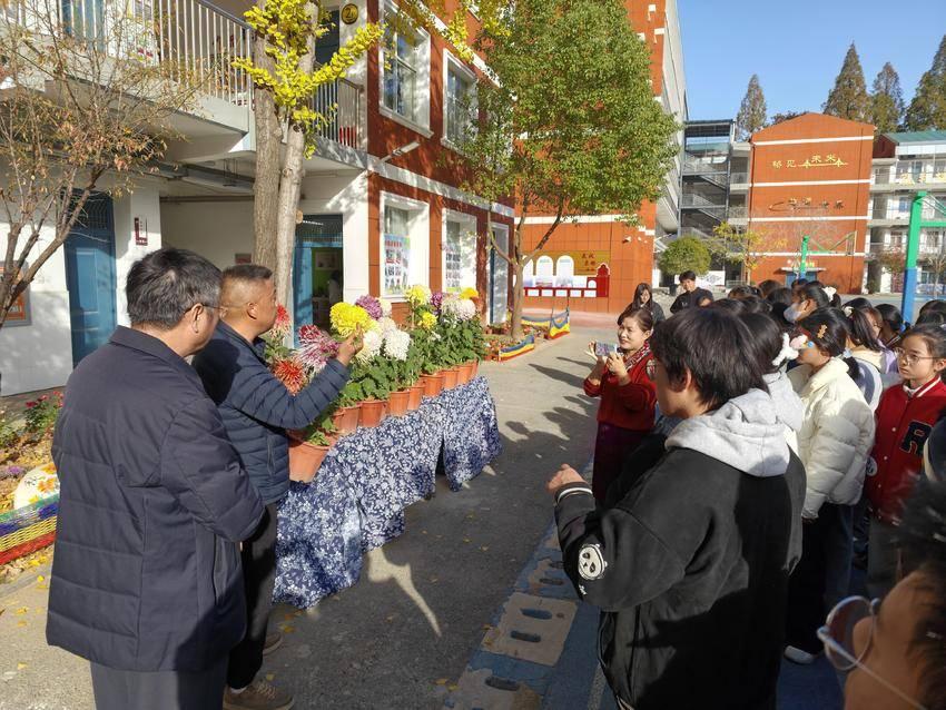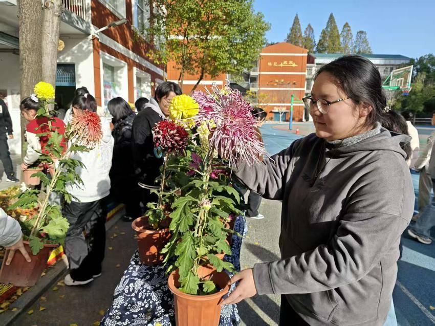送花现场,汉阳公园园长梅复传为弘桥中学的学生开展了菊花养护和菊花插花知识科普小课堂活动,学生和汉阳园林的志愿者们共同在学校设计摆放菊花小景,共同装扮美丽的校园。