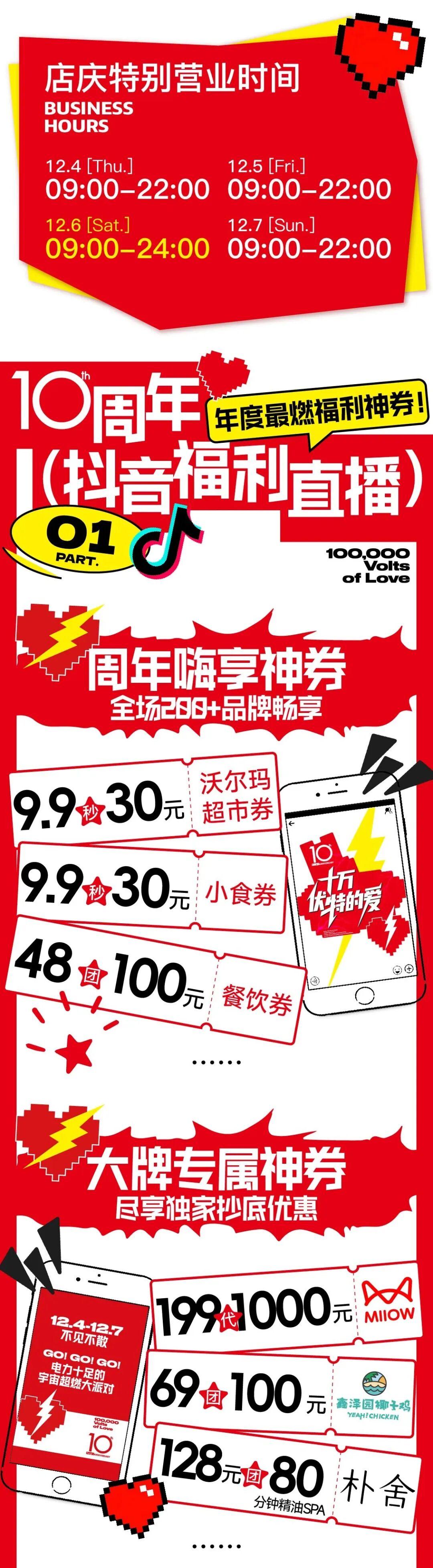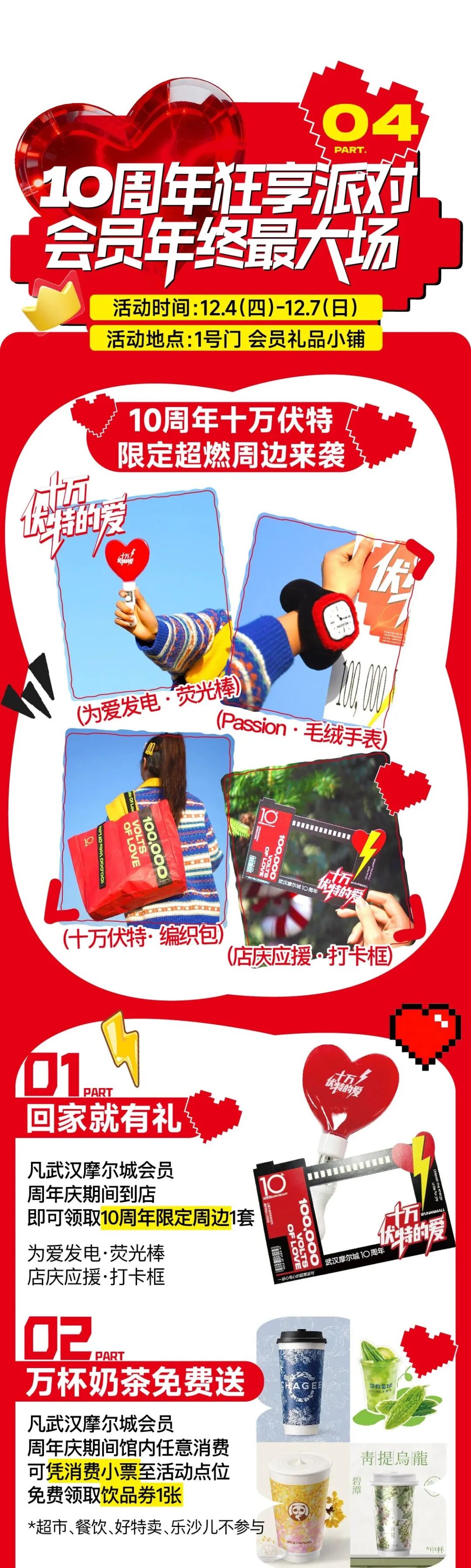 周年庆活动期间,会员到店即可免费领取十周年限定爱心荧光棒,打卡也有礼!还有各种现金券、餐饮券、优惠券,等你来领取~