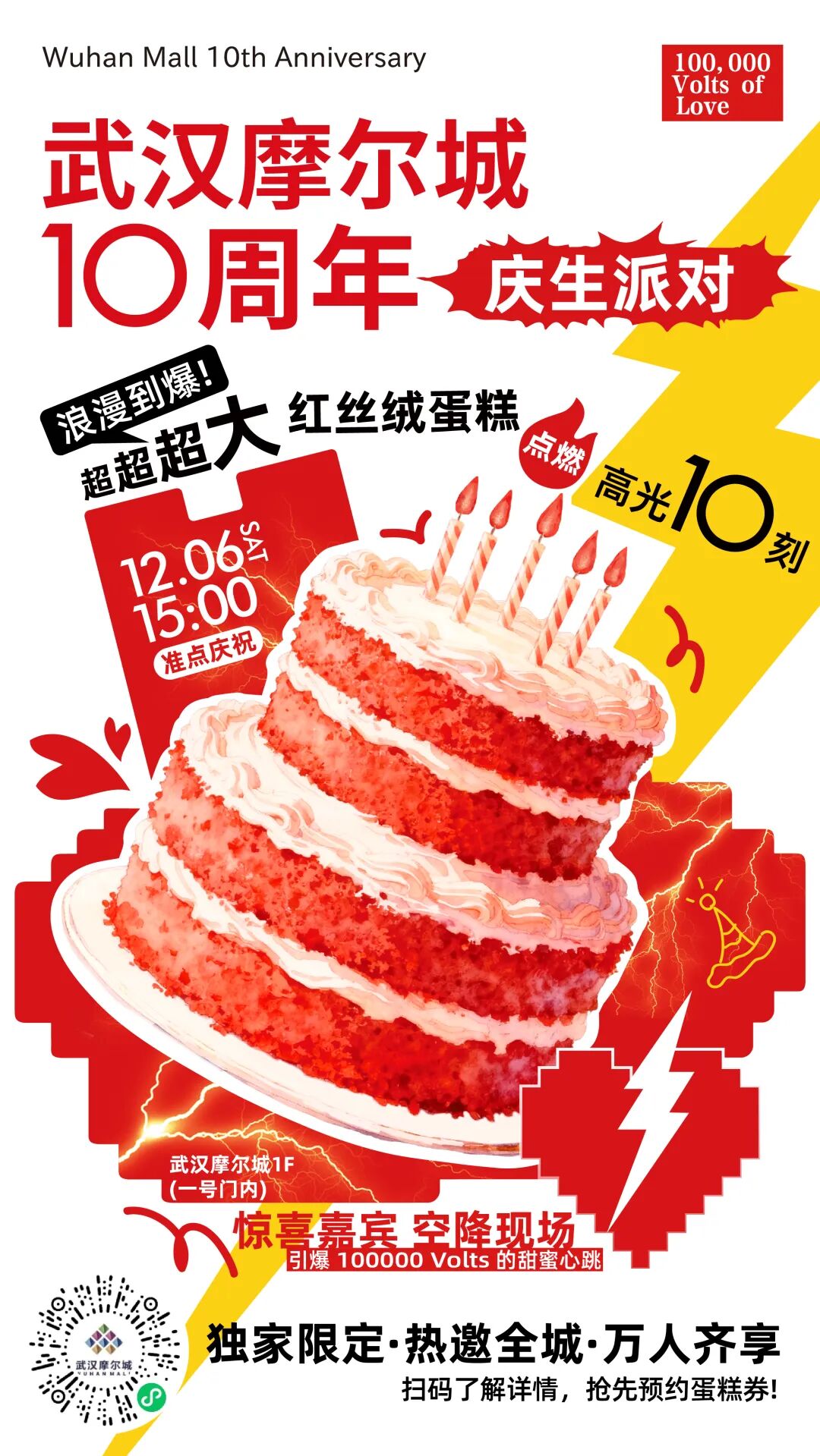 过生日当然要吃蛋糕~12月6日(周六),「武汉摩尔城」联合「祐禾蛋糕」定制超大红丝绒蛋糕,热邀全城5000人分享,共同点亮高光时刻。更有惊喜嘉宾空降现场,引爆甜蜜心跳。