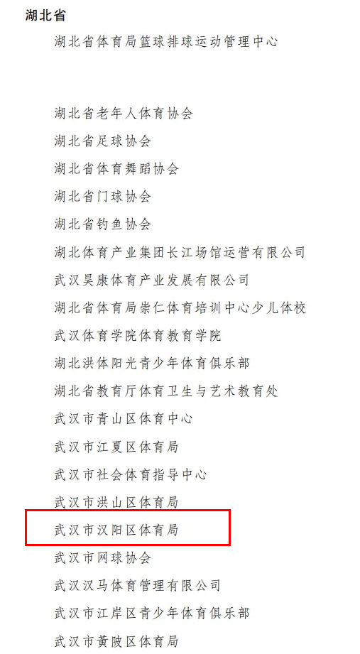 其中,武汉市汉阳区体育局获评2021—2024年度全国群众体育先进单位,武汉市汉阳区文化和旅游局体育科负责人周亮获评2021—2024年度全国群众体育先进个人。