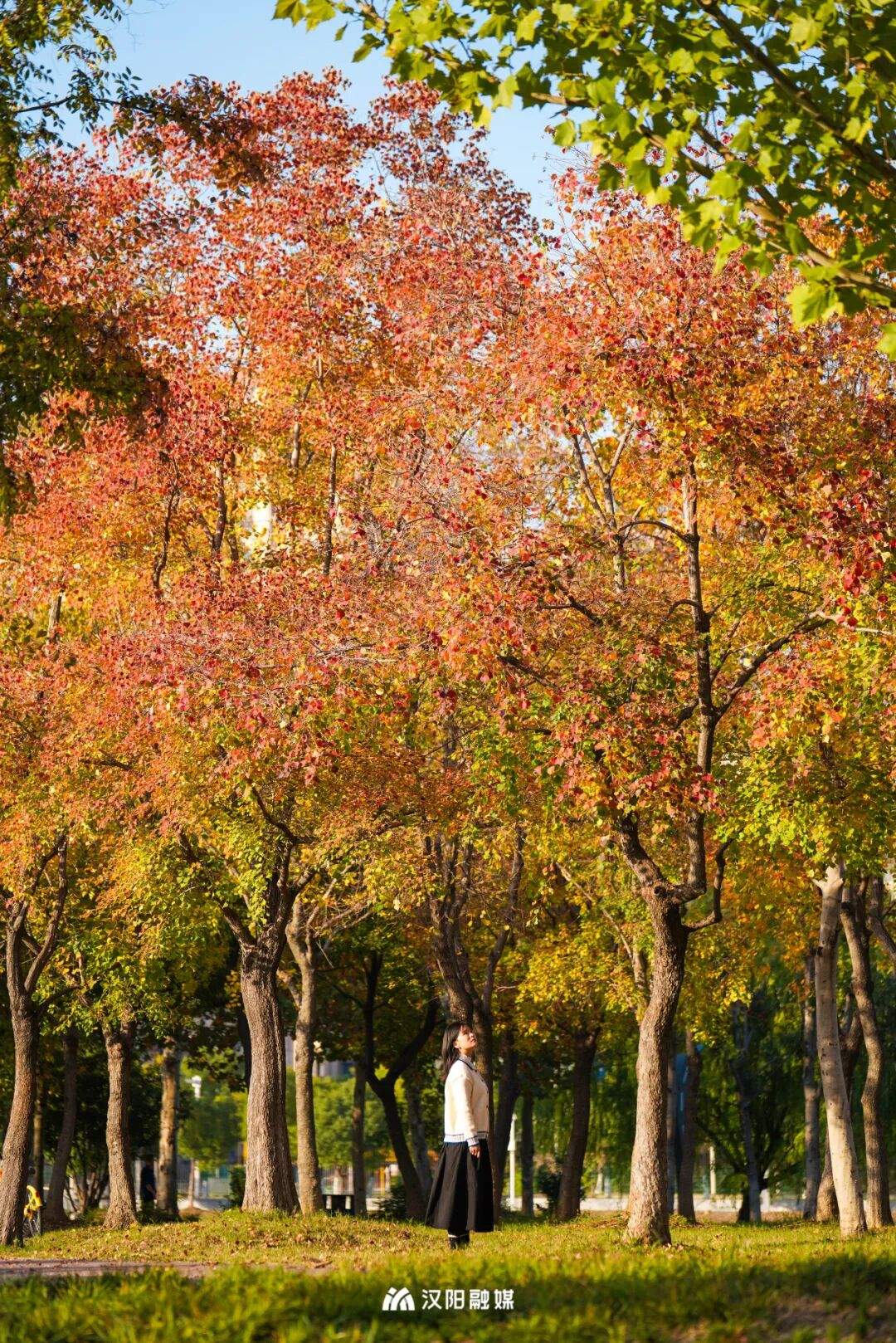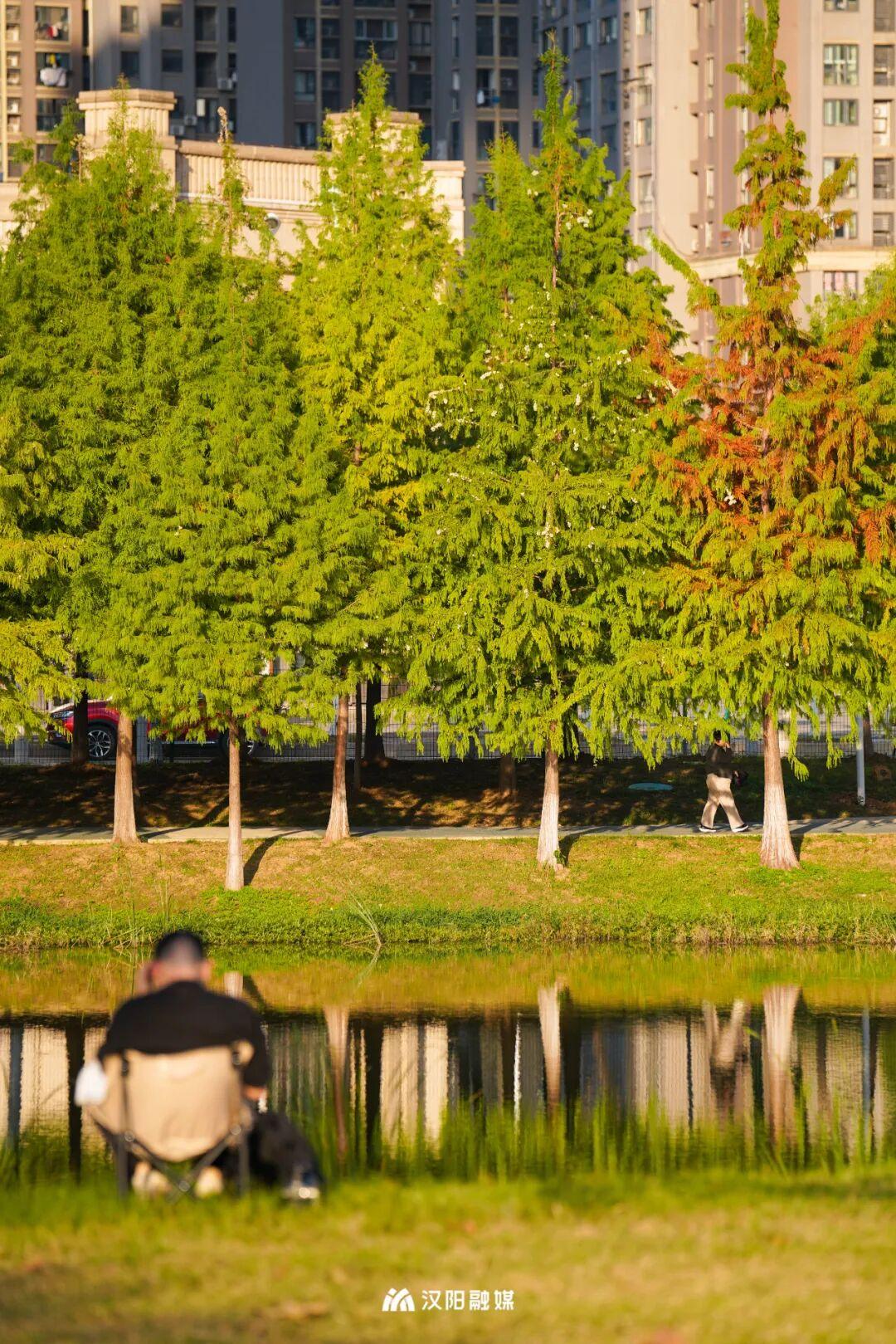 走上半岛,一片大草坪在眼前舒展。最吸睛的,是那一大片斑斓的乌桕树。阳光穿过枝叶,青黄橘红,层层晕染,宛如彩虹,美得不像话。