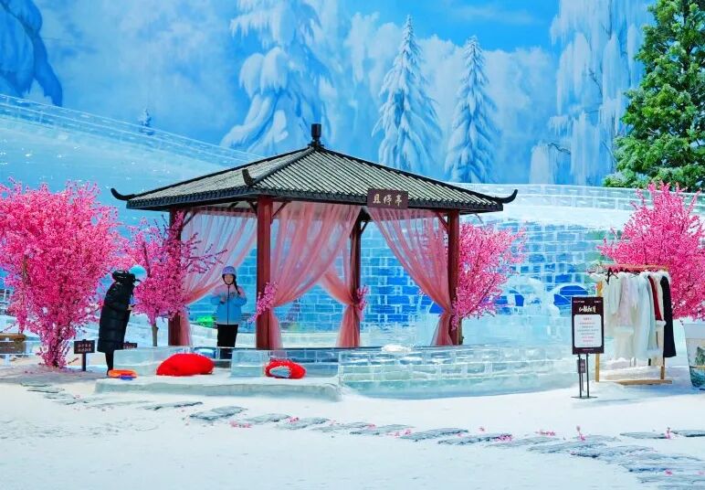 除雪狐互动外,雪场一侧的“三生三世”同款网红打卡点每日开放,同样吸睛。其以仙侠主题贯穿冬季,桃花画轴、冰晶拱门与雪狐巡游区交相辉映,游客穿汉服或仙侠服即可沉浸式穿越至影视剧同款场景。