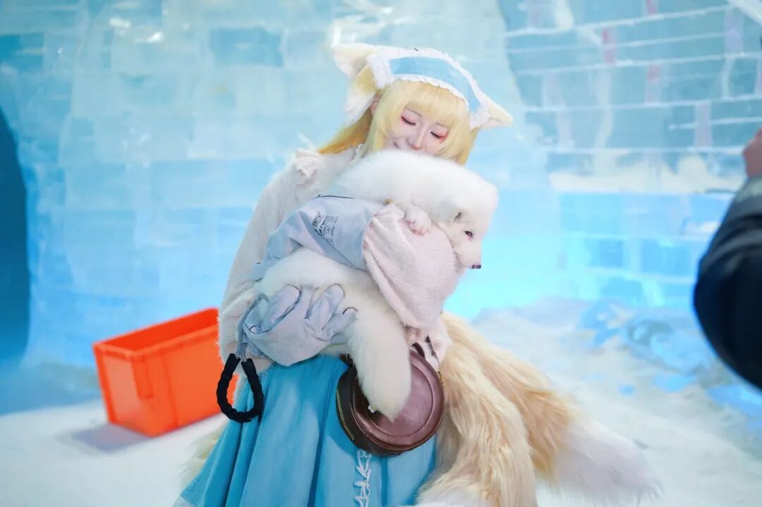 在雪道旁,5只来自东北的雪狐成为游客关注的焦点。这些毛色雪白、体型圆润的动物正在特定区域与游客进行友好互动。据场馆工作人员介绍,该批雪狐均经过专业驯养,性格温顺且具备良好的社交能力,目前“撸狐”已成为此次活动的特色体验项目之一。