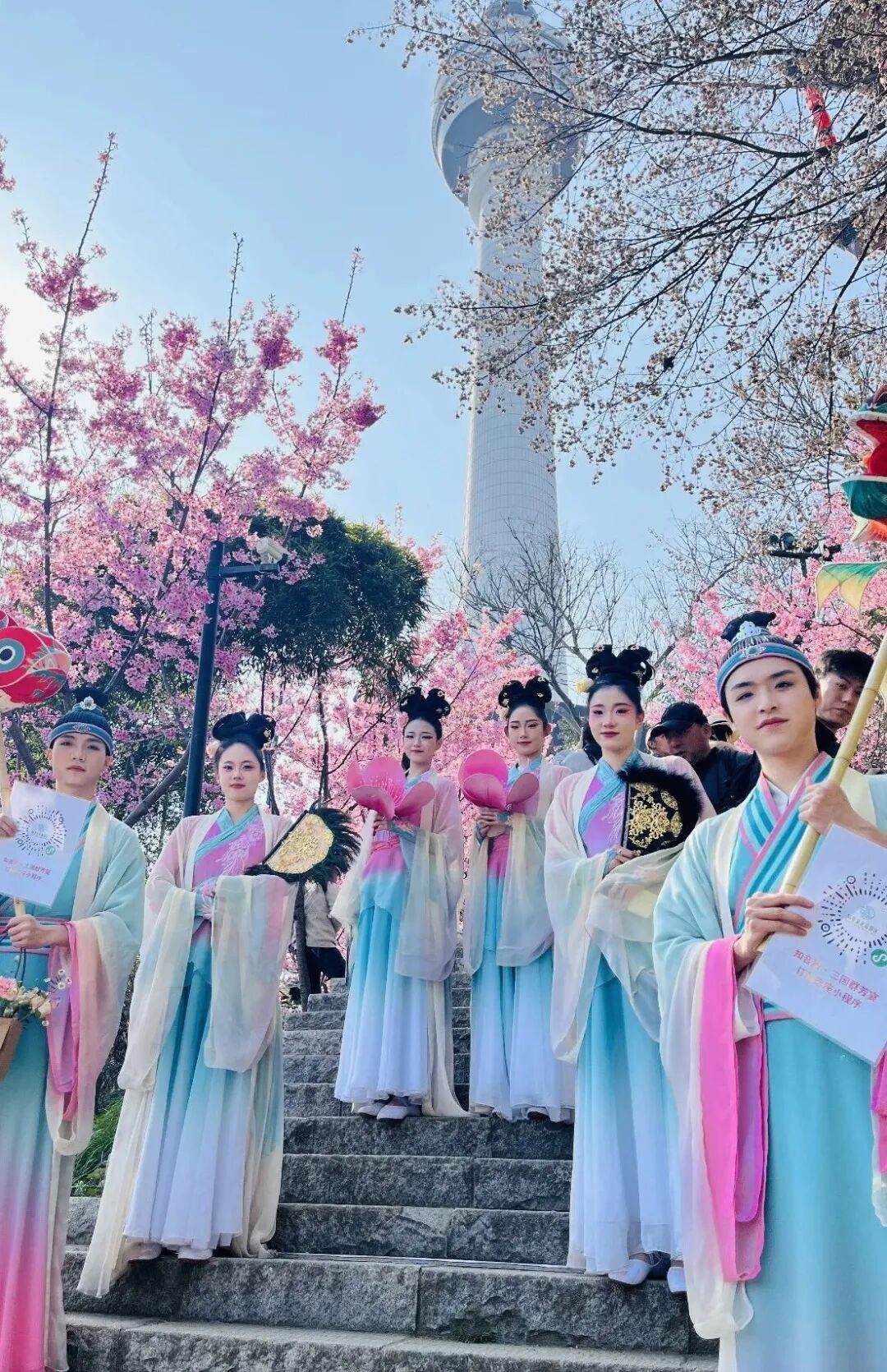 当天,汉阳融媒记者在巴士车厢内看到,扶手上缠绕着仿真樱花枝,车窗贴有樱花图案贴纸,春日气息扑面而来。置物架上,赏花地图、巴士纪念车票供免费取阅。行驶途中,专业导游和来自武汉商学院的随车志愿者讲述景区历史与游玩攻略,身着古风华服的“花神”“簪花郎”惊喜亮相,与车上npc互动,将有机会赢取黄鹤楼酒提供的限定樱花小酒,车厢内欢声笑语,氛围热烈。